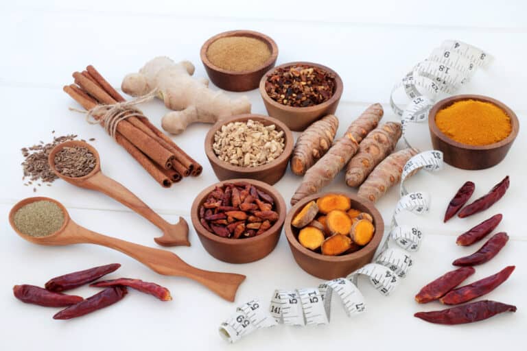 يعتبر الكركم من التوابل المستخدمة بكثرة لنكهته ولونه وخصائصه الطبية القوية المثبتة، والتي تعزى إلى احتواءه على مادة الكركمين، وهي مادة كيميائية تفيد في فقدان الوزن أيضاً. فقد أظهرت الدراسات أن تناول الكركم مرتين يومياً لمدة شهر واحد يعزز تقليل دهون البطن ويزيد فقدان الوزن بنسبة تصل إلى 5%.