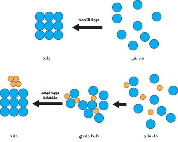 ولكن، إذا اختلط الماء مع الملح، تصبح درجة التجمد للمحلول أقل من صفر. وذلك لأن الملح يثبط قدرة جزيئات الماء على تشكيل بلورات الجليد الصلب. ويعتمد مدى انخفاض درجة التجمد على مدى ملوحة المحلول.