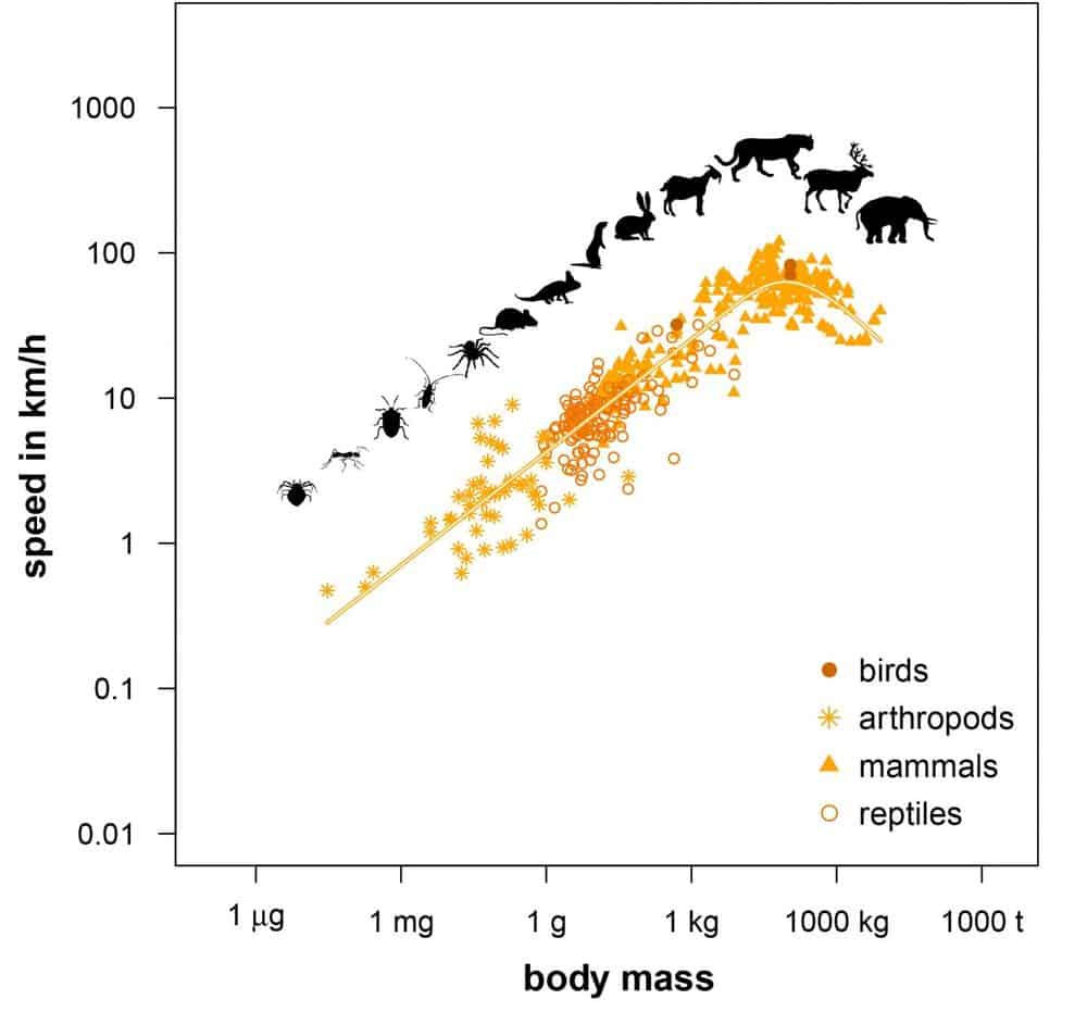 يبدو من المنطقي أن تكون الحيوانات الأكبر هي الأسرع، فهي تملك أكبر العضلات. ولكن الأمر غير ذلك. فالفهد يتصدر قائمة الحيوانات السريعة بسرعة تصل إلى 113 كم/ساعة، مع أنه أصغر بكثير من الحيوانات الأكثر ضخامة. أما الحيوانات الأكثر ضخامة فيتضح ببساطة أنها لا تستطيع الوصول إلى السرعات الشديدة التي تؤهلها لها عضلاتها نظرياً، فهي تنهَك قبل الوصول إلى هذه السرعات بوقت طويل. وتملك ساق الفيل الحجم الأكبر من العضلات سريعة الانقباض(وهي العضلات التي تساعد في العدو السريع) ،ولكن الفيل يستنفد الأوكسجين قبل أن يصبح قادراً على استخدام هذه العضلات على النحو الأمثل.