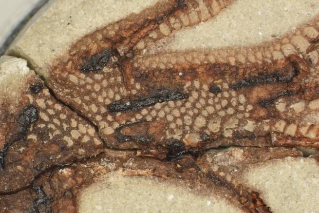 قدم سحلية مغطاة بالحراشف، محجرة اصطناعياً.