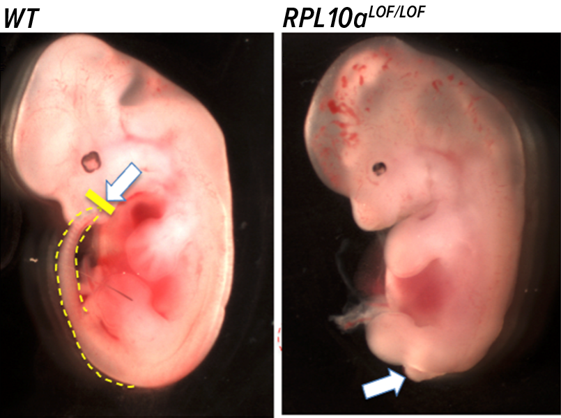 على نحو مشابه، الجسيمات الريبية التي تفتقر إلى بروتين آر بي إل 10 أيه أقل عرضة للارتباط بالرنا الرسول الذي يرمّز مجموعة مهمة أخرى من بروتينات النمو الجنيني، والتي تؤدي أدواراً في مسار يحمل اسم "مسار إشارات دبليو إن تي" (Wnt signaling pathway). يؤدي انخفاض عدد هذه البروتينات البالغة الأهمية إلى توقّف عملية النمو على نحو فجائي بعد نمو الطرف الخلفي، ما يعطي الانطباع بأن الطرف الخلفي مقطوع.