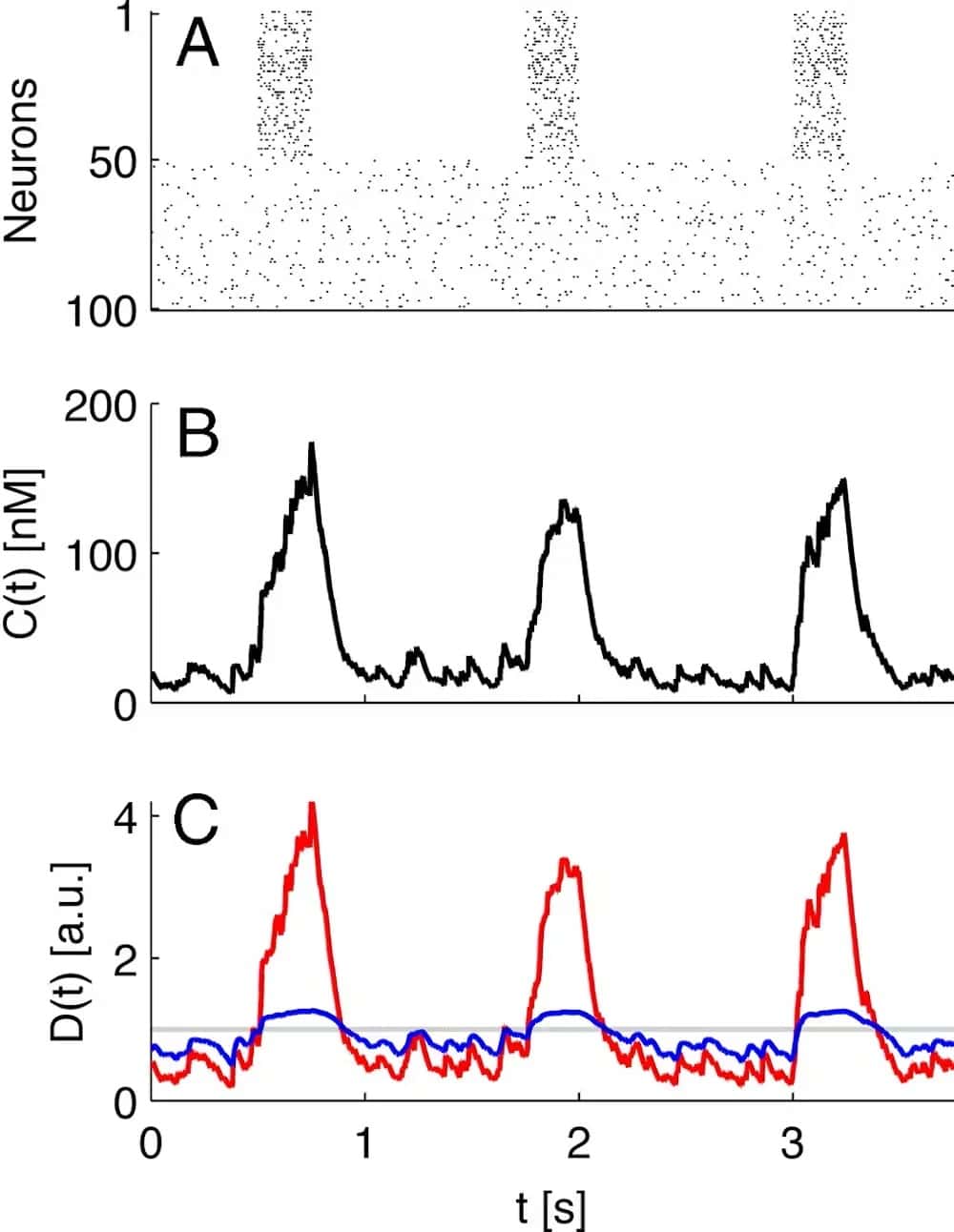 تعتمد طرق التحكّم بتأثيرات الدوبامين التي انتشرت مؤخراً على نوع الإفراز الذي يبدو مثل القمم والقعور فقط. عندما ترسل العصبونات المفرزة للدوبامين الإشارات في دفعات طورية، مثل نشاطها لإرسال الإشارات المتعلقة بأخطاء التنبؤ بالمكافأة، يُفرَز الدوبامين في مختلف مناطق الدماغ. تحدث هذه الذروات في نسب الدوبامين بسرعة كبيرة لأن العصبونات المفرزة يمكن أن تطلق الإشارات عدة مرات في أقل من ثانية واحدة.