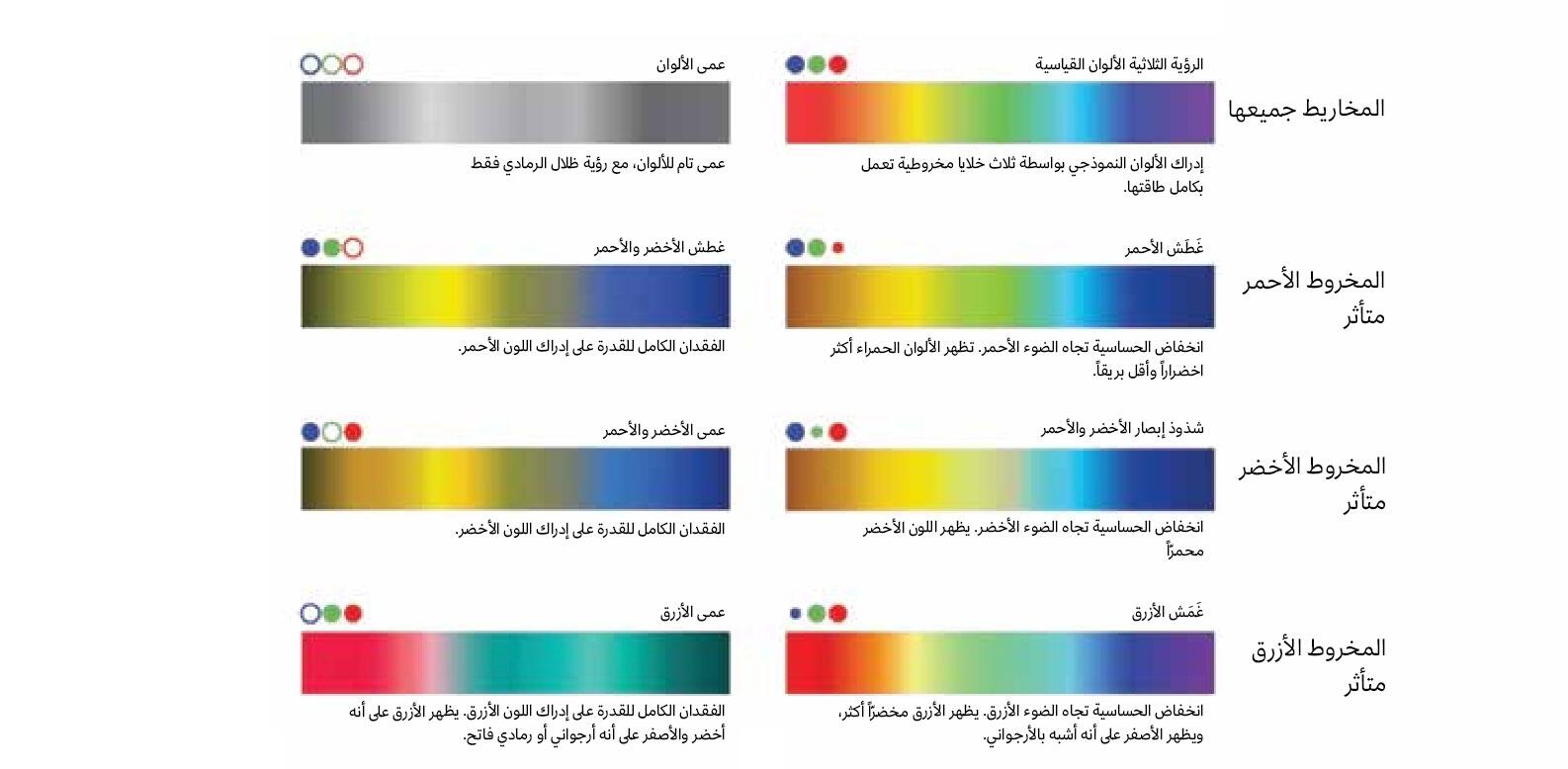 قد تتراوح الاختلافات بين حالات قصور الرؤية اللونية من الخلل في عمل نوع واحد من الخلايا المخروطية الثلاث إلى الغياب البصري الكامل للألوان، وهي حالة تحمل اسم "عمى الألوان". إذا كان نوع واحد من المخاريط مصاباً، يمكن أن يؤدي ذلك إلى الخلط البصري بين الأزرق والأخضر أو الأصفر والرمادي أو الأزرق والأرجواني وغير ذلك.
