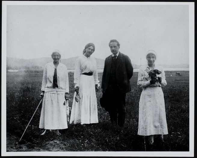 التُقطت هذه الصورة في يوليو 1915، في سيلين، بجزيرة روغن في ألمانيا، لأينشتاين مع زوجته الثانية "إلسا" على اليسار، وابنته "ليسيرل" أقصى اليسار، وربيبته (بنت زوجته) مارغوت.