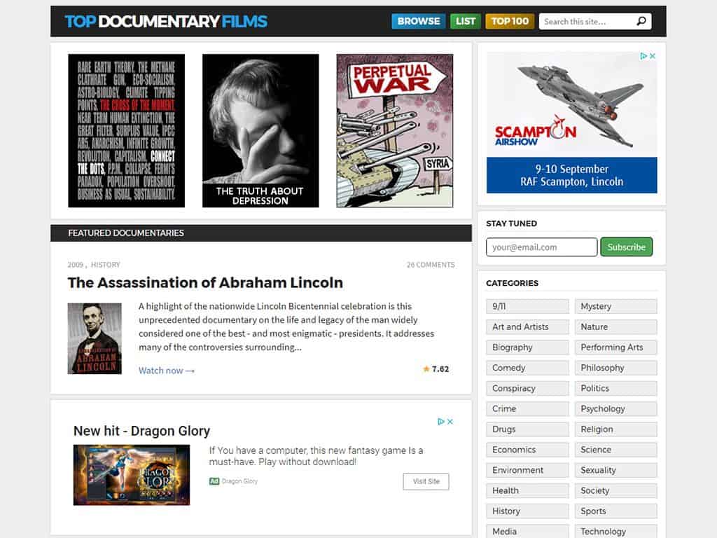 إذا كنت تفضل الواقع على الخيال، فإن توب دوكيومينتاري فيلمز هو الموقع المناسب لك لمشاهدة الأفلام المجانية. وقد أعجبنا المجال الواسع من الأفلام الوثائقية في هذا الموقع، إضافة إلى تصميم الواجهة وتوزيع عناصرها، والذي يسهل كثيراً من عملية استعراض المجموعة الكبيرة من الأفلام ومشاهدة ما ترغب منها.