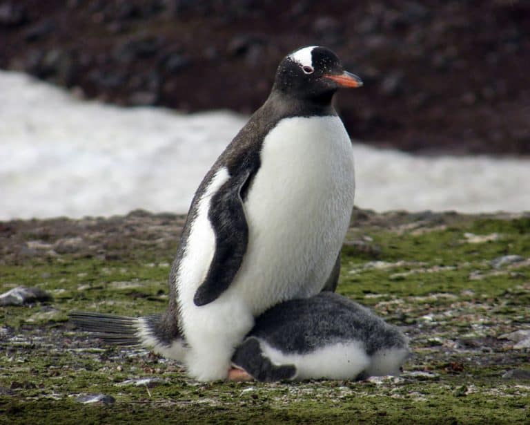 بطريق جينتو مع صغيره في منطقة بوتر كوف بجزيرة الملك جورج.