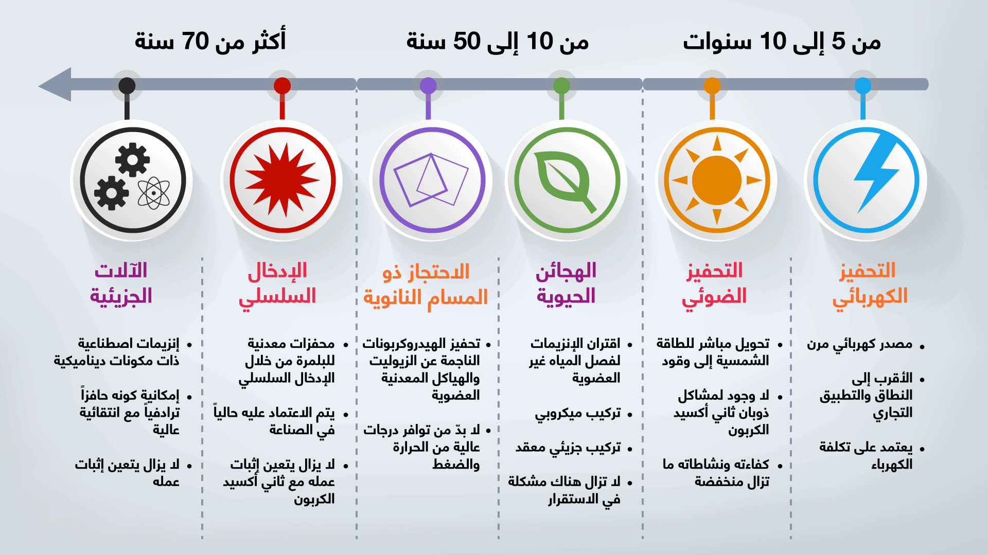 وفي حين لا تزال تقنيات التحويل في مهدها، إلا أن الباحثون يعتقدون بأن العقود القادمة ستحقق تقدماً كبيراً. ففي غضون خمس إلى عشر سنوات على سبيل المثال، يمكن للتحفيز الكهربائي - الذي يحفز التفاعلات الكيميائية من خلال الكهرباء - أن يقلل من تكلفة تحويل ثاني أكسيد الكربون إلى وقود ومنتجات أخرى. وفي غضون 50 سنة أو أكثر، يمكن للتقنيات النانوية أن تقود عمليات التحويل، وفقاً للعلماء.