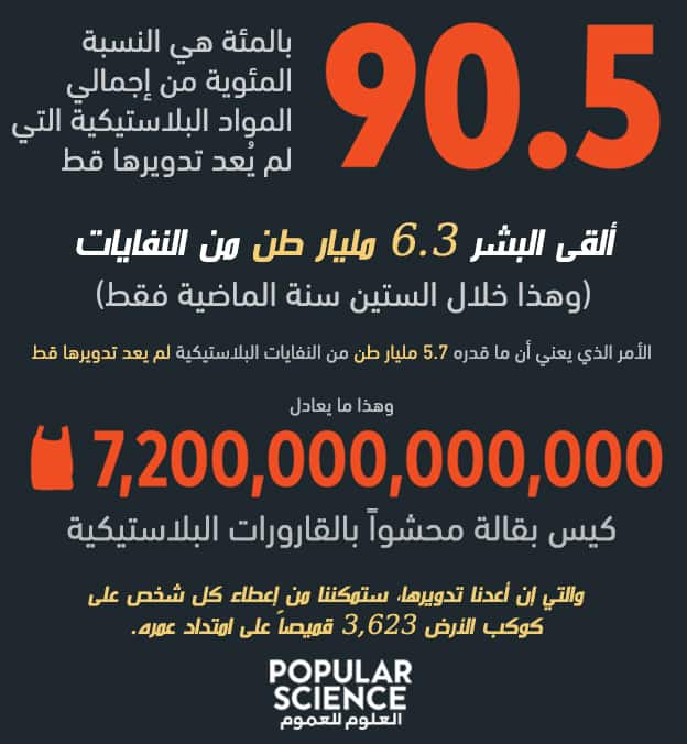يتمثل الرقم الإحصائي المُختار لسنة 2018 في العدد 90.5: هو النسبة المئوية لإجمالي النفايات البلاستيكية التي لم يعد تدويرها قط.