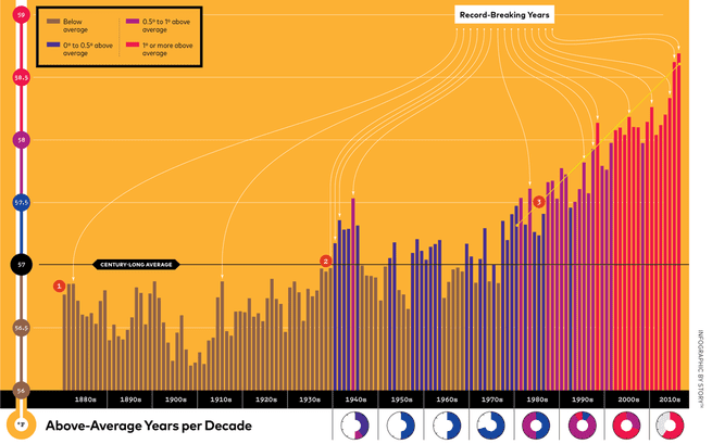 كان عام 2016 هو العام الذي شهد تسجيل أعلى درجات الحرارة منذ بدأ البشر بحفظ السجلات، مع ارتفاع كبير في متوسط درجات الحرارة العالمية لليابسة وسطح الماء حتى وصل إلى 14.8 درجة مئوية. هذا يعني ارتفاعاً بمقدار 0.9 درجة مئوية عن متوسطها خلال القرن العشرين. قد لا تبدو قيمة الارتفاع كبيرة، إلا إذا عرفنا أن الفرق بين متوسط درجات الحرارة العالمية في الوقت الحالي، ومتوسطها خلال أحد العصور الجليدية القديمة – عندما كانت الولايات المتحدة تقبع تحت الأنهار الجليدية على عمق حوالي 914 متراً – هو فقط 2.78 درجة مئوية أو نحو ذلك فقط، وذلك وفقاً للسجل المناخي المحفوظ في الجليد والأشجار. ويظهر نفس السجل ببساطة أن تغيرات بهذا الحجم لم يسبق لها أن حدثت خلال قرن واحد من الزمن.
