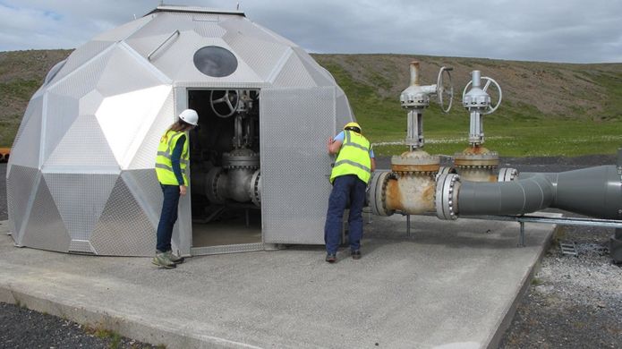 ثم يتم ضخ السائل الفوار عبر الأنابيب إلى موقع الحقن الذي يقع على بعد 2 كيلومتر، وهو هيكل قباني يشبه الكوخ الثلجي في تصميمه الهندسي، ويبدو وكأنه من عالم آخر. ليتم ضخه من هناك نحو الأسفل مسافة 1,000 متر تحت سطح الأرض.