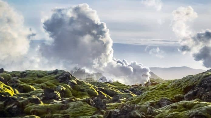 منتشرةً بشكل متداخل بين الجبال المغطاة بالثلوج في غرب آيسلندا، تقبع متاهة من المراوح التوربينية والأنابيب التي تنفث سحباً كثيفة من البخار. هذا البنيان الضخم مسؤول عن توفير الطاقة للبلد الذي يستمد كامل طاقته الكهربائية من مصادر الطاقة المتجددة.