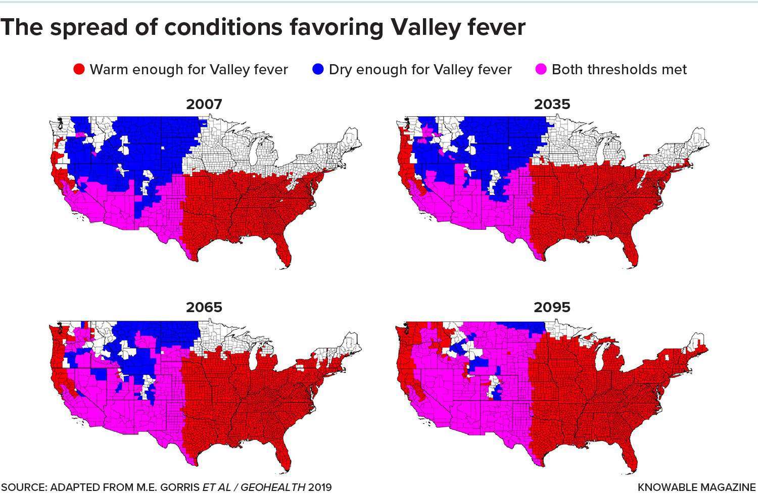 لكن في يومنا هذا، قد يساعد ارتفاع درجة حرارة الكوكب على انتشار بعض مسببات الأمراض الفطرية إلى مناطق جديدة. خذ حمى الوادي مثالاً. يمكن أن يتسبب هذا المرض بأعراض تشبه أعراض الإنفلونزا لدى الأشخاص الذين يستنشقون الأبواغ المجهرية لفطر الكروانية اللدودة. وفقاً لدراسة حديثة أجرتها عالِمة نظام الأرض في مختبر لوس ألاموس الوطني في ولاية نيو مكسيكو، مورغان غوريس، قد تسود الظروف المناخية المؤاتية لانتشار حمى الوادي في 217 مقاطعة بـ 12 ولاية أميركية حالياً.
