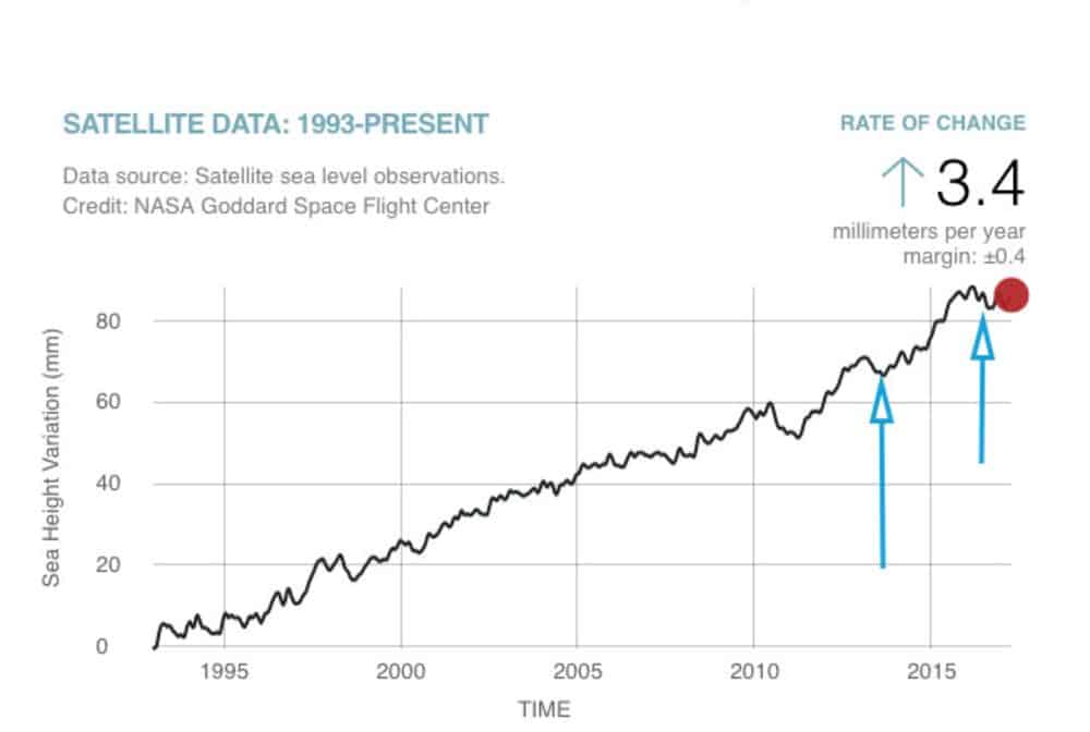 يشير الأشخاص الذين يتداولون هذه النتيجة الخاطئة عادة إلى الرسم البياني الظاهر أعلاه، والذي يظهر بيانات الأقمار الصناعية لناسا، والتي قد تترك انطباعاً بأن مستوى سطح البحر يتراجع. ولكن هذا يعود إلى أنهم يأخذون جزءاً صغيراً من البيانات خارجة عن سياقها. فإذا قمت بتصغير الصورة، فسوف تجد أن الانخفاض في الصورة ليس نتيجة لتراجع مستوى سطح البحر، ولكنه تباين طبيعي يحدث مع كل أنواع الظواهر المناخية.