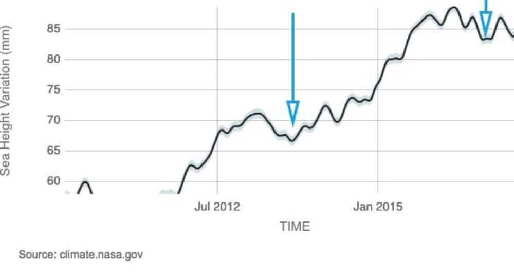 ويشبه هذا التغير في الرسم البياني المتداول على نطاق واسع عملية التبرز هذه: حيث تتقلب أحياناً مستويات سطح البحر بمقدار ضئيل بين سنة وأخرى، ولكن هذا لا يغير من حقيقة أن هذه المستويات آخذة في الارتفاع بشكل عام. ولتأكيد هذا، قامت مجلة بوبيولار ساينس - العلوم للعموم بإرسال رسالة بالبريد الإلكتروني إلى تابيو شنايدر عالم المناخ في معهد كاليفورنيا للتكنولوجيا، والذي يعمل مع مختبر الدفع النفاث التابع لناسا (والذي وضع هذه البيانات).