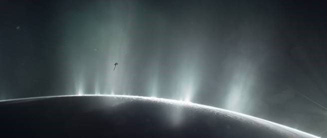 تخيل فني للمركبة الفضائية كاسيني وهي تغطس عبر فوارات إنسيلادوس في 2015. مصدر الصورة: ناسا/ مختبر الدفع النفاث – معهد كاليفورنيا للتكنولوجيا