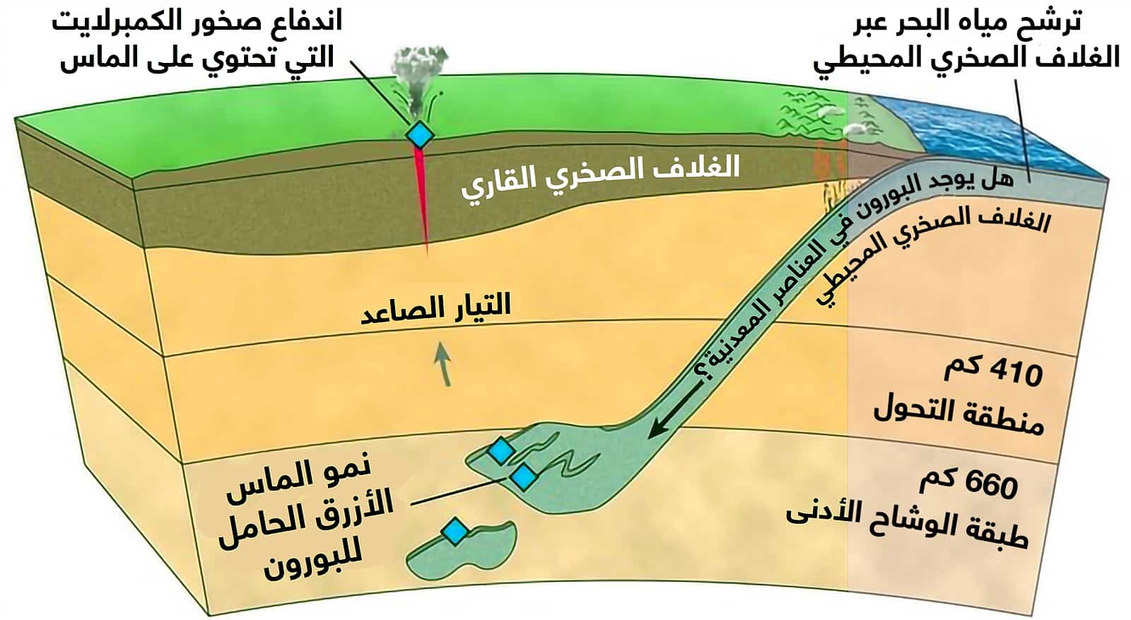 يقول سميث: "إن نوع الصخور التي نراها ممثلة في هذه المشتملات المعدنية هي صخور المحيط؛ فمن الممكن البورون قد استقلَّ بسهولة صفائح المحيطات التكتونية التي تغرق وصولاً إلى طبقة الوشاح الأدنى، ثم ورثت هذه الماسات الزرقاء ذلك البورون".