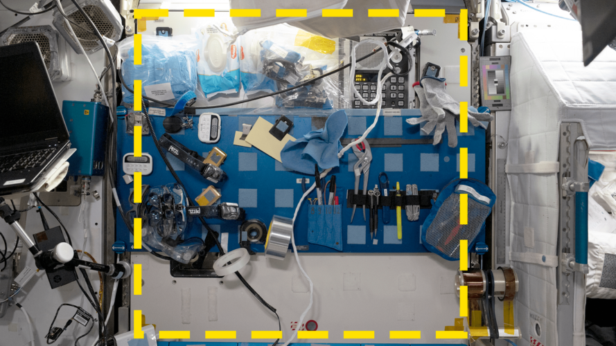 تركز الدراسة الجديدة على النتائج التي استخلصها رواد الفضاء من أول موقعين موثّقين بالكامل للعيّنة، وهما موقع مربّع الشكل مخصص رسمياً لصيانة المعدات وآخر يقع بالقرب من معدات التمرينات الرياضية والمراحيض في المحطة. تمكّن الباحثون من تحديد 5,438 مثالاً من "القطع الأثرية" المستخدمة لتلبية احتياجات مختلفة باستخدام برنامج تحليل صور جديد مفتوح المصدر طوّروه بأنفسهم. تضمنت هذه القطع سماعة الواقع المعزز وملاحظات لاصقة وقفازات وأجهزة وأدوات للكتابة مثل الأقلام من العلامة التجارية شاربي (Sharpie). بعد جدولة هذه القطع، قارن الفريق الصور اليومية بتقارير النشاط التي أعدّها رواد فضاء المحطة لتحديد توافق الاستخدام الفعلي لهذه المساحات مع تسمياتها الرسمية المفترضة.