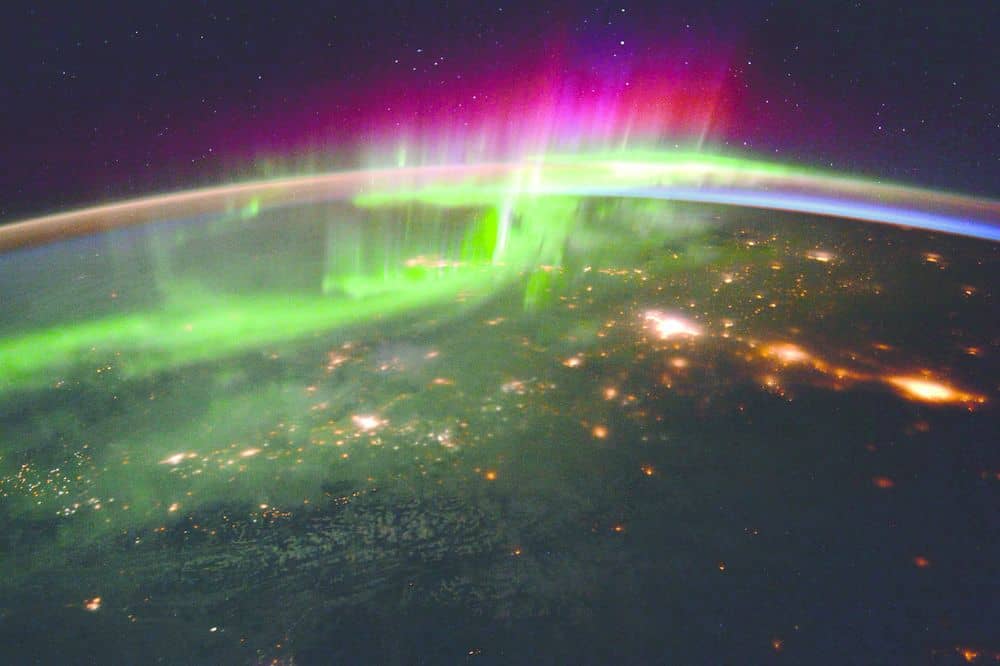 الشفق القطبي فوق كندا الشمالية. تدرج اللون الأحمر الظاهر هو نتيجة الأوكسجين الذري المثار على ارتفاعات شاهقة والنشاط الشمسي الأكثر كثافة.