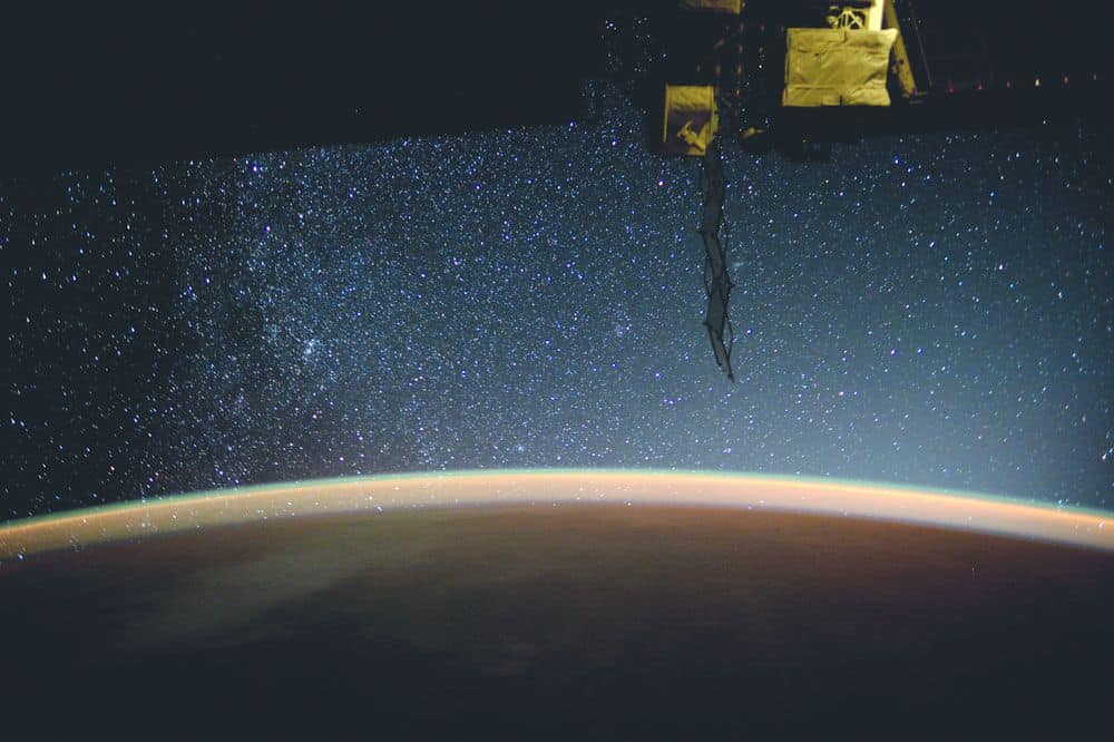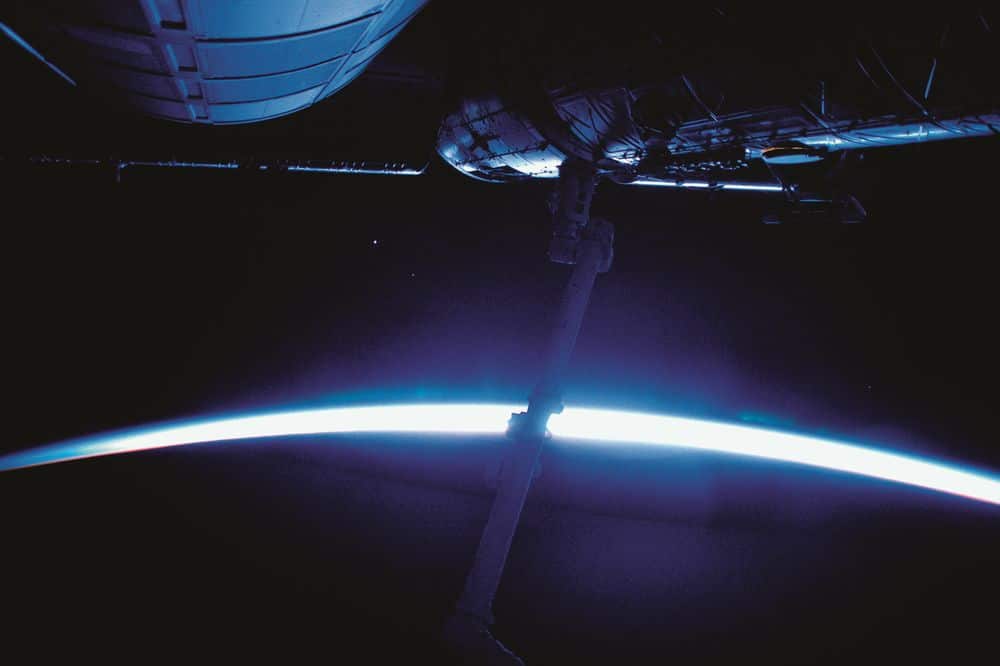 تكتسب محطتنا الفضائية توهجاً أزرق اللون قبل شروق الشمس مباشرة، يا له من منظر رائع! عند النظر إلى الأمام من نافذة القبة "كوبولا"، تبدو المختبرات اليابانية والأوروبية مضاءة.