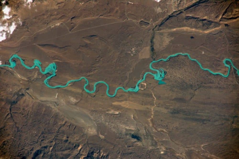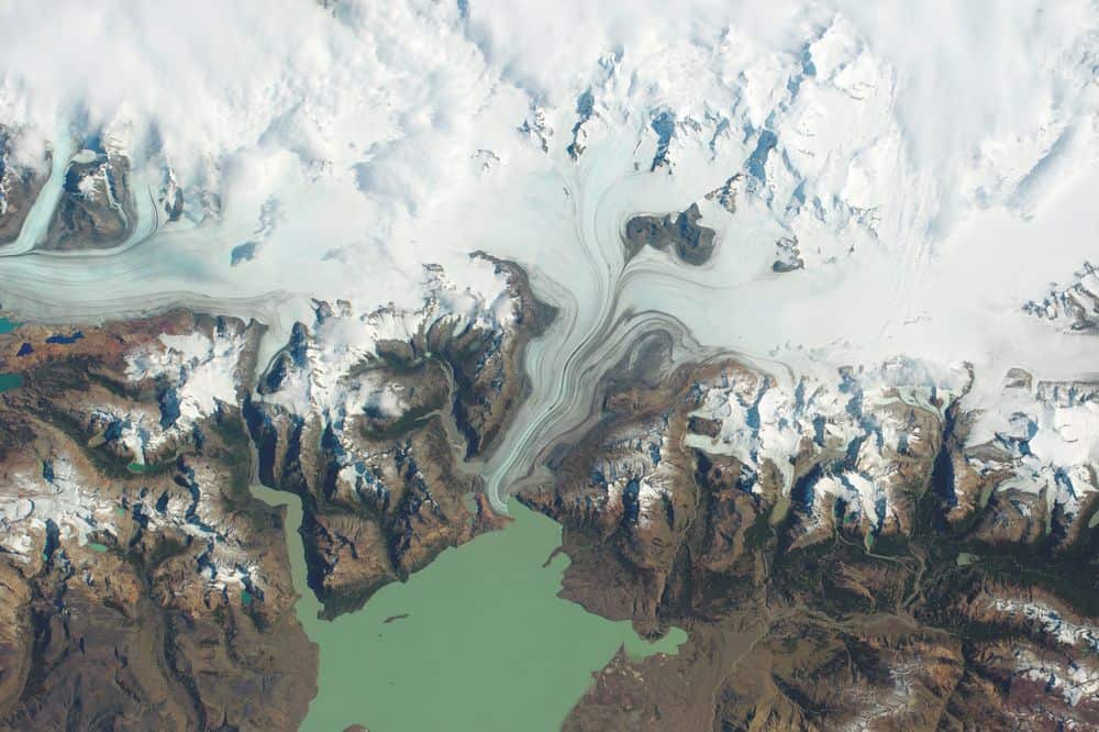إنه ريو سانتا كروز بكل عظمته! فاللون الفيروزي الرائع لهذا النهر الجليدي يمكن تمييزه بشكل مذهل من الفضاء. متدفقاً من حقول الجليد في باتاغونيا، يشق طريقه شرقاً عبر الأرجنتين ليصب في المحيط الأطلسي الجنوبي.
