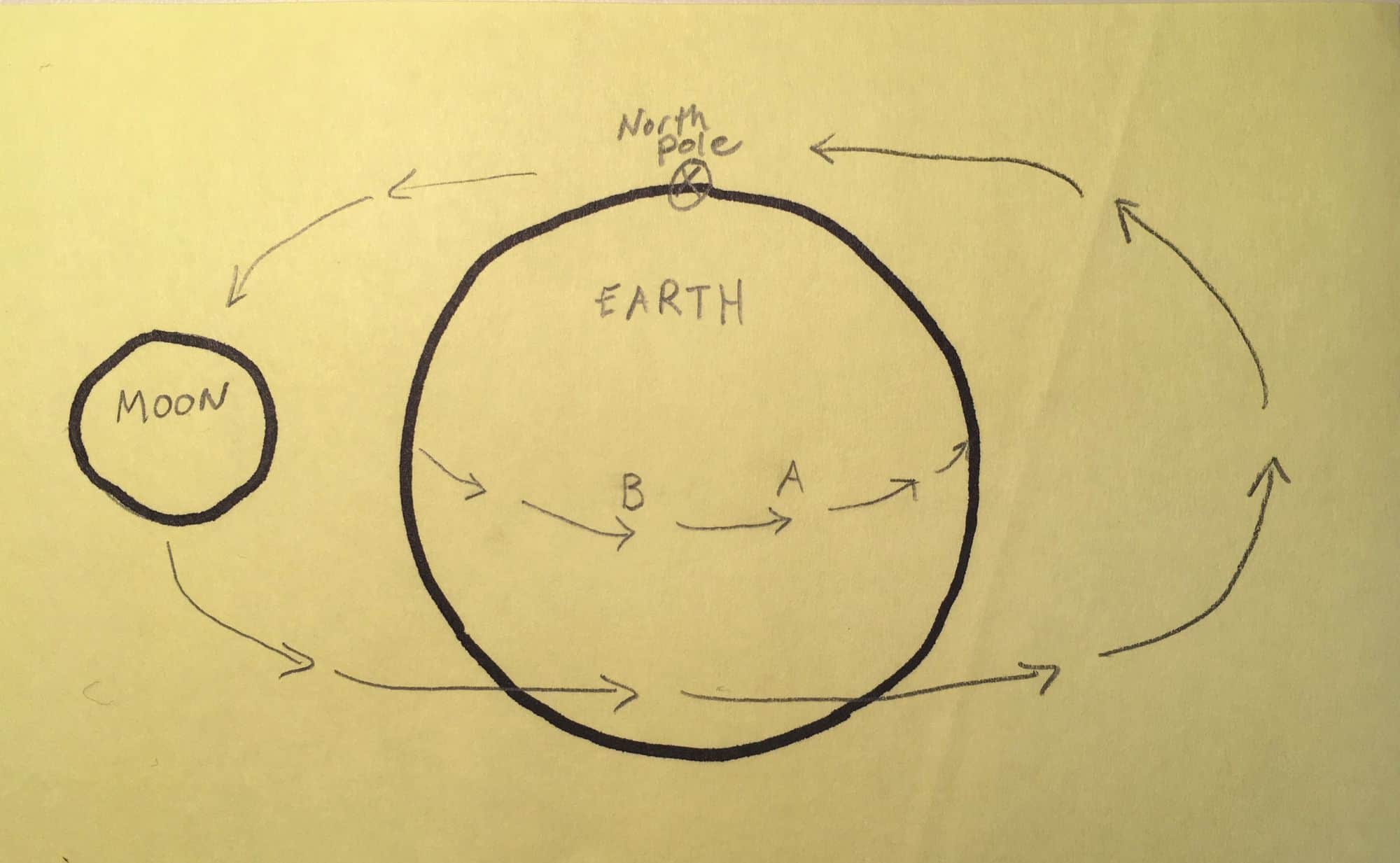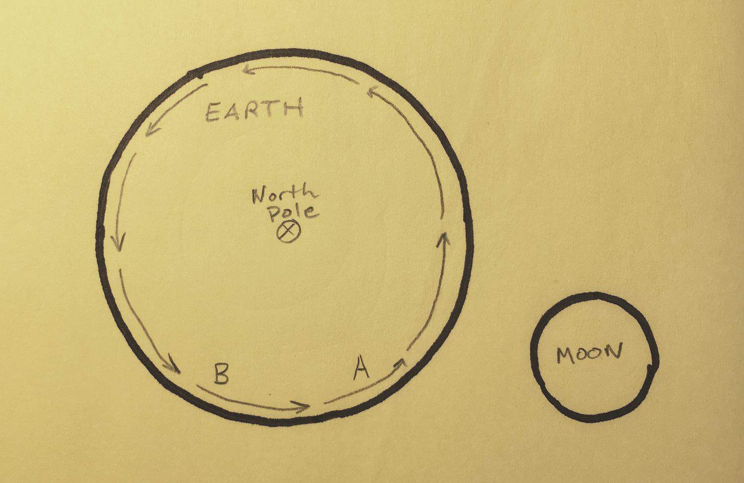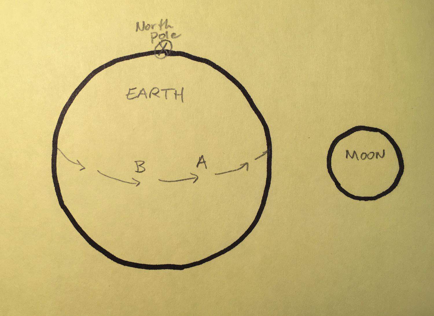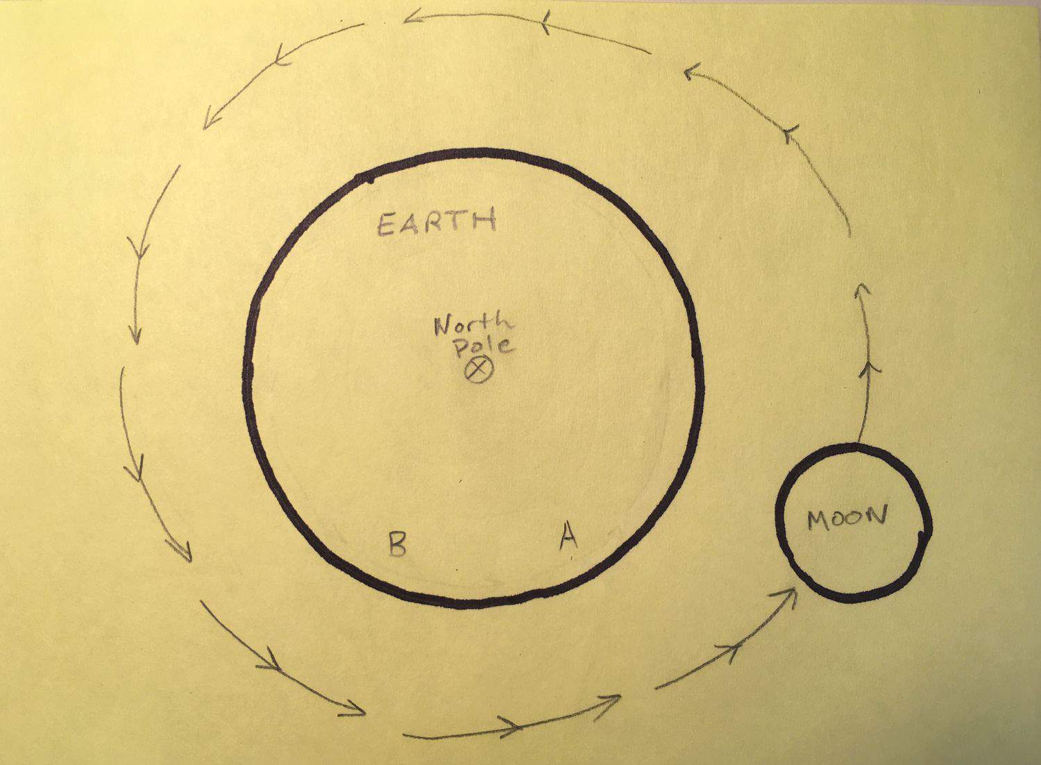 في الرسم التمثيلي أعلاه، سترى النقطة "A" القمر في أفقها قبل أن تتمكن "B" من ذلك، بسبب الطريقة التي تلتف بها الأرض حول نفسها. بالنظر إلى هذه الحالة مرة أخرى من وجهة نظر جانبية، يمكنك أن ترى أن A تقع إلى الشرق من B: