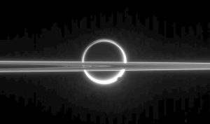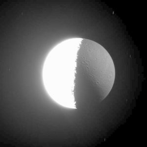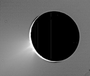 ينتهي المطاف ببعض الجزئيات المتدفقة من القطب الجنوبي لإينسيلادوس كجزء من الحلقة E لزحل، والتي تبدو في الصورة كشريط ساطع خلف القمر.