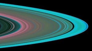 تشير الألوان المزيفة إلى أحجام الدقائق ضمن الحلقات. يتضمن اللون الأرجواني دقائق أكبر من 5 سم، ويشير الأخضر إلى دقائق أصغر من 5 سم، أما الأزرق فيعني دقائق أصغر بكثير، أقل من 0.84 سم.