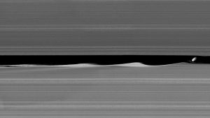 تتسبب جاذبية هذا القمر، والذي يبلغ قطره 8 كيلومتر، بتشويش مدار الحبيبات في الحلقات، ما يتسبب بتموجات تستقر لاحقاً بشكل تدريجي.