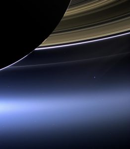 النقطة الزرقاء الساطعة تحت حلقات زحل هي الأرض، على بعد 1,430 مليون كيلومتر تقريباً.