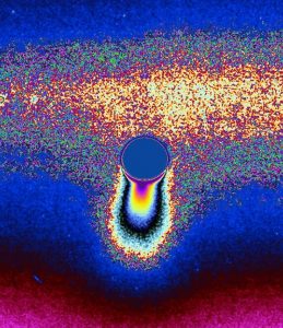 نجم يتألق عبر الحلقة B. ويستعين العلماء بتذبذب ضوء النجم لقياس كثافة دقائق الجليد والغبار في الحلقة.