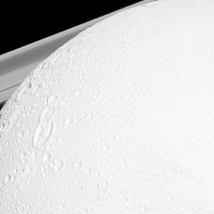 تبدو لمحة من حلقات زحل في زاوية هذه الصورة لسطح إينسيلادوس الجليدي.