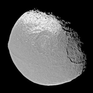 التقطت كاسيني أول صورة قريبة للابيتوس في 2007. وهنا نرى الجانب الفاتح المغطى بالجليد، ولمحة من الجانب الداكن المعرض لضربات الحطام.
