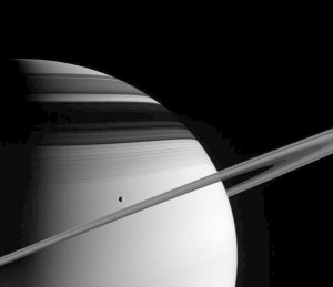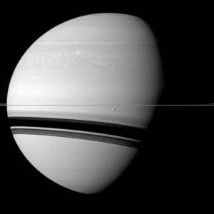 النقطة الظاهرة في منتصف هذه الصورة هي قمر صغير يبلغ عرضه حوالي 396 متر. وقد اكتشفه علماء كاسيني بفضل ظله الطويل.