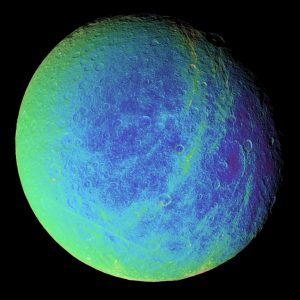 صورة مزيفة الألوان، تبرز الشقوق والحفر على سطح القمر ريا.