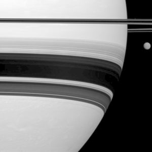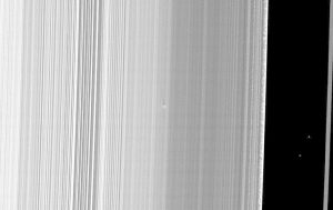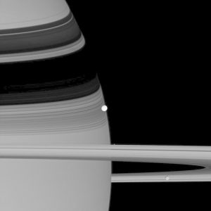 هل يمكنك أن تكتشف الأقمار الثلاثة في هذه الصورة؟ أكثرها سطوعاً هو القمر الجليدي إينسيلادوس. ويظهر القمر باندورا تحت إينسيلادوس، مباشرة فوق الحلقات. ويختبئ ميماس في الحلقة السفلى.