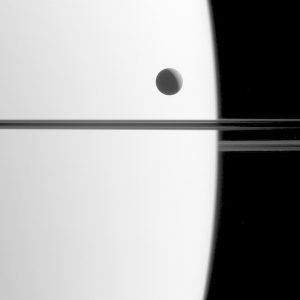 يظهر القمر ديون في هذه الصورة عابراً أمام زحل وحلقاته، مشكلاً ما يشبه إيموجي الوجه الحيادي في برامج الدردشة على الإنترنت.