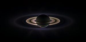 تبدو بعض حلقات زحل الخافتة أكثر وضوحاً مع إضاءة خلفية من الشمس.
