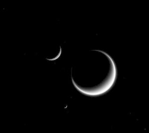 يدور حول زحل الكثير من الأقمار (62 وفقاً لأحدث المعلومات)، وبالتالي، ليس من الغريب أن تظهر عدة أقمار في لقطة واحدة. وقد التقطت كاسيني ثلاثة أقمار في هذه الصورة: تيتان (الأكبر)، ريا (في الجهة اليسرى من الأعلى)، وميماس.