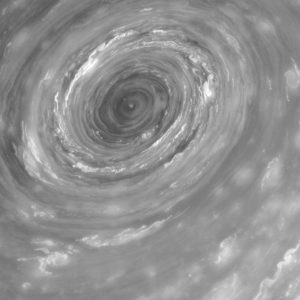 دوامة باتساع حوالي 2,000 كيلومتر تدور في مركز الشكل السداسي العملاق على زحل. وهي أكبر بحوالي 50 مرة من عين الإعصار الوسطية على سطح الأرض.