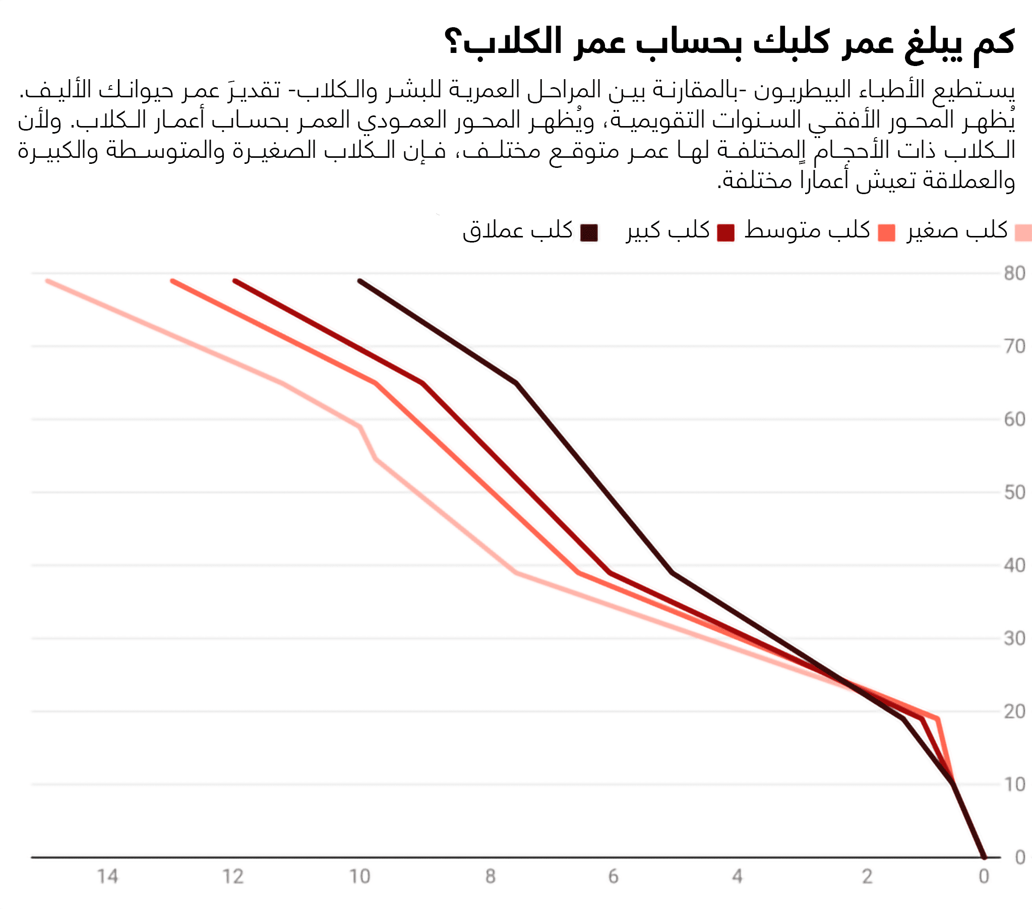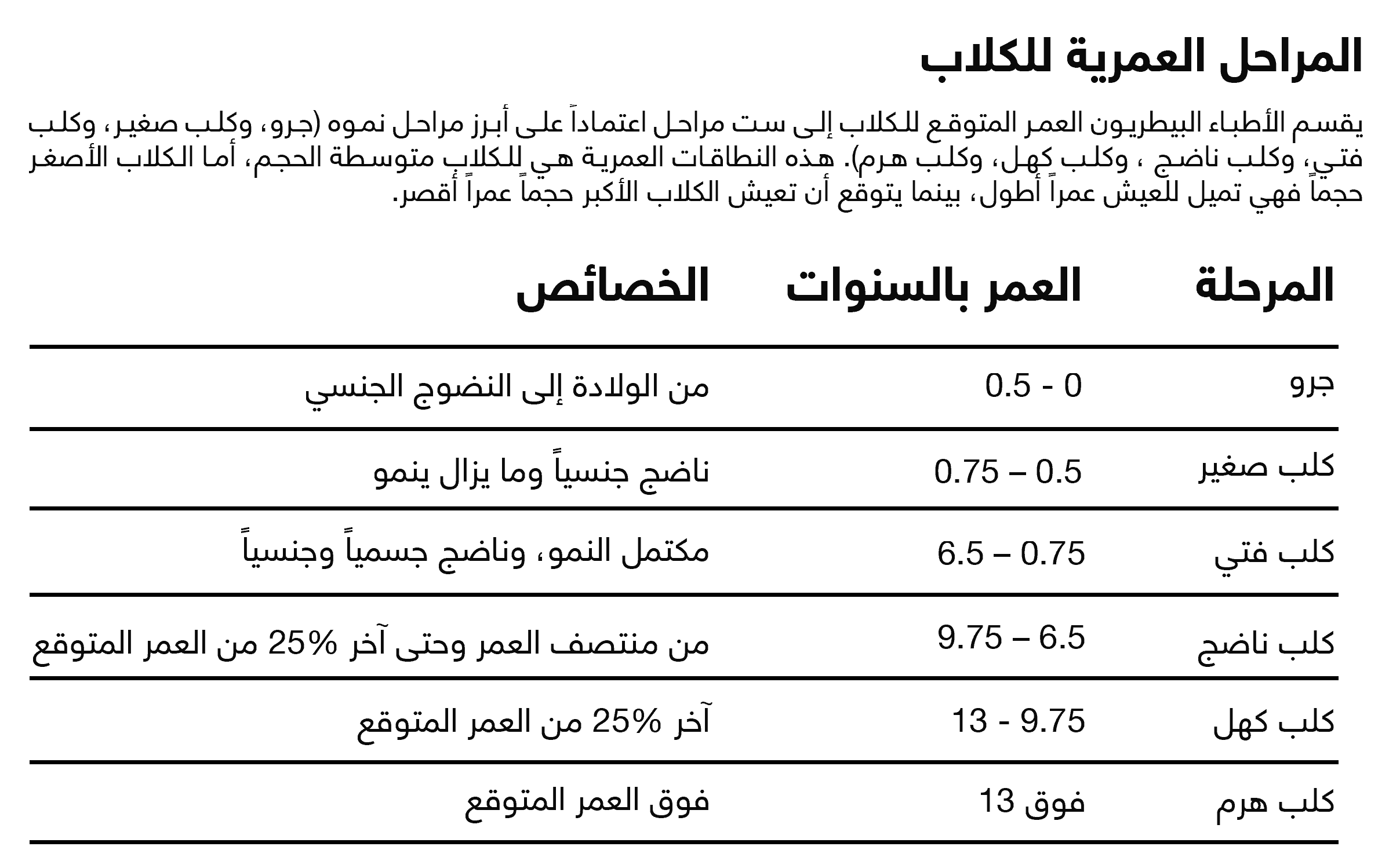 حقوق الصورة: موقع "ذا كونفرزيشن"، الجمعية البيطرية الأميركيةيقسم الأطباء البيطريون العمر المتوقع للكلاب إلى ست مراحل اعتماداً على أبرز مراحل نموه: (جرو، وكلب صغير، وكلب فتي، وكلب ناضج، وكلب كهل، وكلب هَرِم)، وهذه النطاقات العمرية هي للكلاب متوسطة الحجم، أما الكلاب الأصغر حجماً فهي تميل للعيش عمراً أطول، بينما يتوقع أن تعيش الكلاب الأكبر حجماً عمراً أقصر.