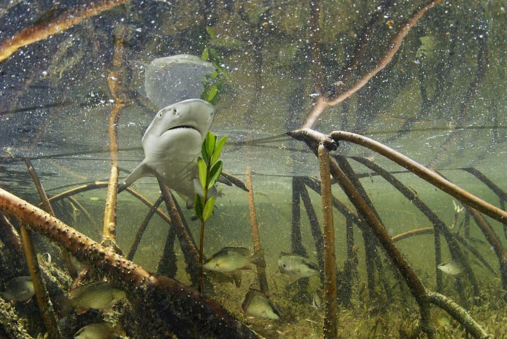 غابة المنغروف التي في الصورة والتي تقع في بيميني بجزر الباهاما، هي حضانة لصغار القرش الليموني التي ستصبح في عمر عدة أسابيع نسخة مصغرة عن القرش الليموني البالغ. وتحفظها جذور المنغروف آمنةً من الحيوانات المفترسة خلال الشهور الأولى من حياتها، قبل أن تتوجه إلى المياه المفتوحة. وكنت أريد أن ألتقط صوراً لأسماك القرش في هذه المرحلة الحساسة من حياتها لأظهر للناس أن هذه الحيوانات هي أكثر من مجرد حيوانات مفترسة. فهي كائنات فاتنة، ذات أبعاد متعددة، وحياة غنية.