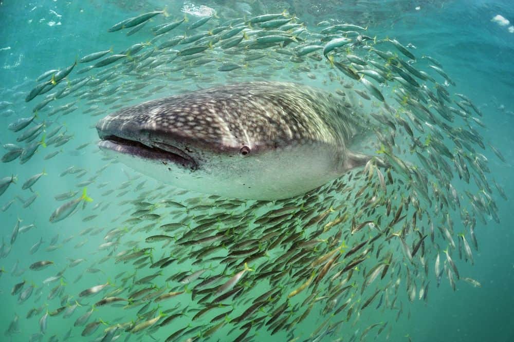 قرش الحوت محاطاً بسمك سكاد.