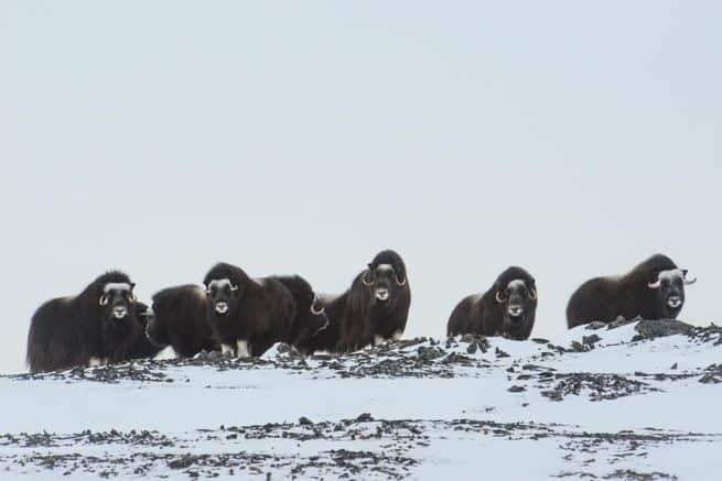 تقضي بعض الحيوانات الجريئة فترة الشتاء في مناطق التندرا. ويشم ثور المسك رائحة النباتات تحت الثلج ويتباهى بمعطفه السميك الذي يعتبر أدفأ بثمانية أضعاف من صوف الأغنام. وتعتمد الرنة أيضاً على اثنين من المعاطف لتبقى دافئة. وفي حين أن أنوفها ربما لا تحس بالدفء تماماً، فهي مليئة بالأوعية الدموية لتدفئة الهواء القادم إليها. كما أن لديها خدعة للتعامل مع الظلام. يقول كوري ويليامز، عالم الفيزيولوجيا في جامعة ألاسكا فيربانكس: "في ظل ظروف الإضاءة الخافتة، تمتلك الرنة هذا التكيف الغريب في عيونها التي تسمح لها باستخدام ضوء الأشعة فوق البنفسجية أكثر من العين العادية". وتساعدها قدرتها على الرؤية في الطيف فوق البنفسجي على تمييز النباتات في الثلج.