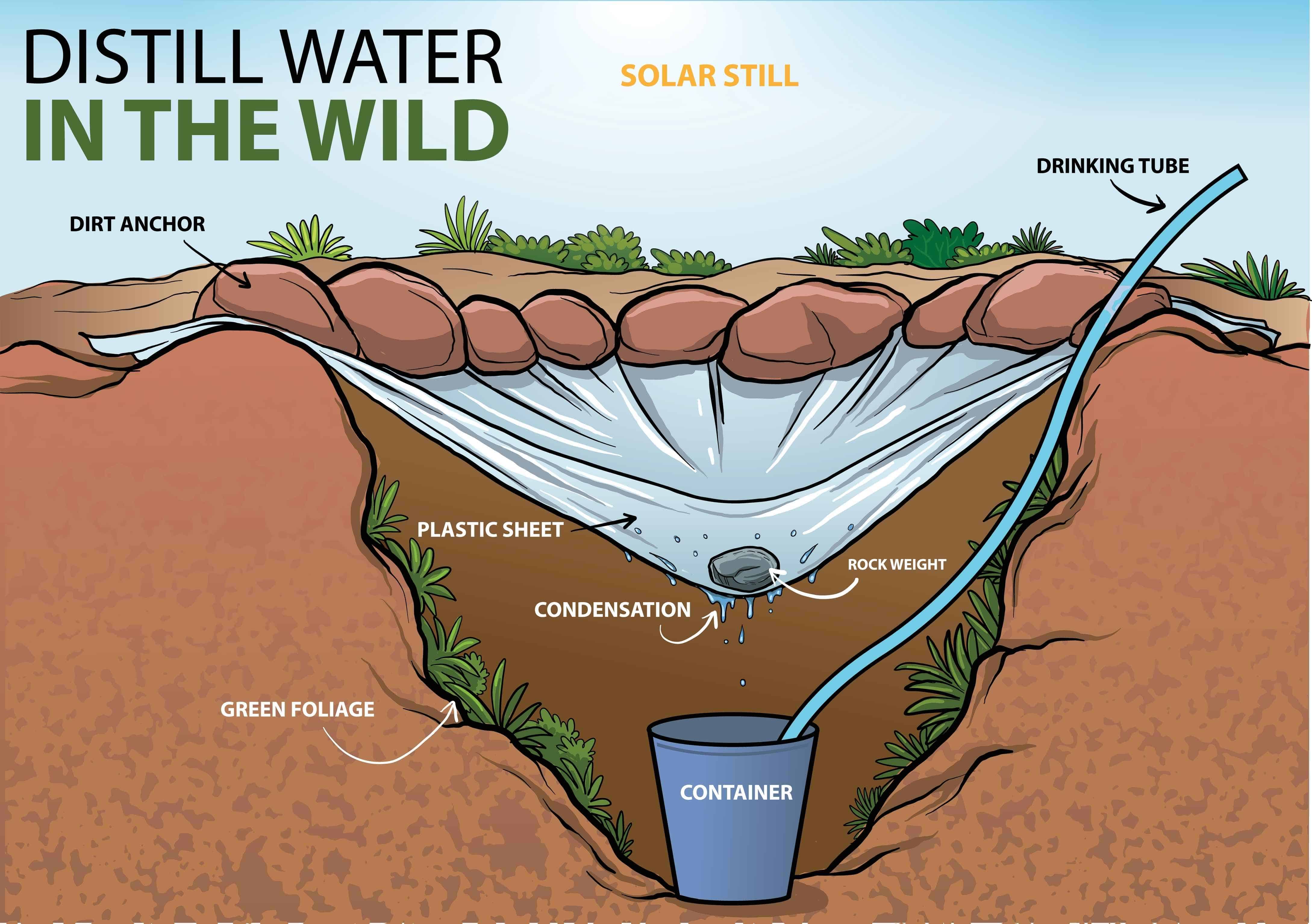 - اصنع مكثفاً للمياه، عن طريق صنع حفرة في الرمال ووضع كيس من النايلون فوقها، ووضع حصاة صغيرة فوق الكيس، ما سيجعل كل المياه المتكثفة تسقط نحو الوسط، وضع علبة أو وعاءً لتجميع المياه تحت الكيس.