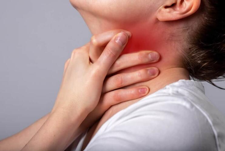 - وضع يد واحدة أو كلتا اليدين حول الحنجرة.