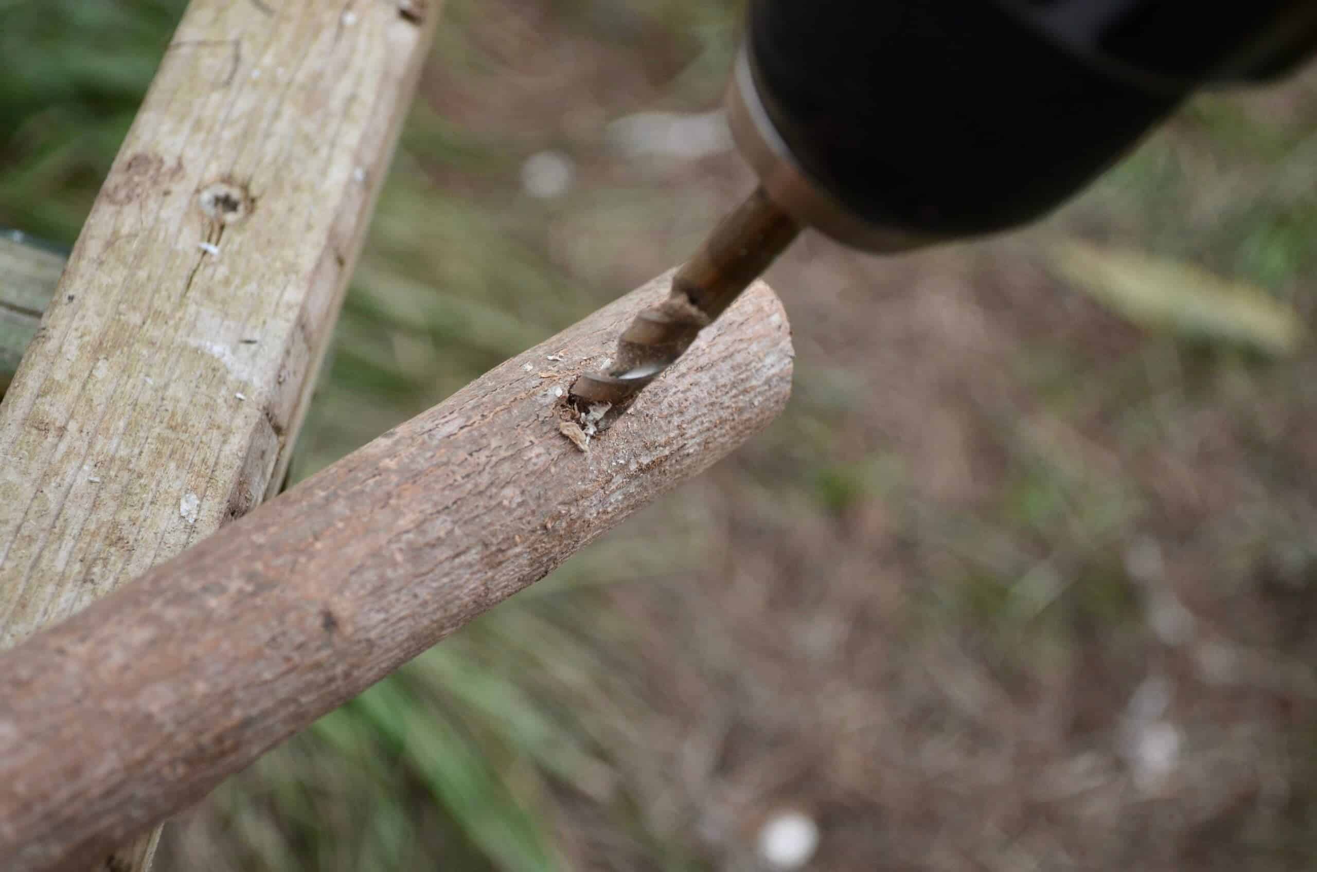 يعتمد موقع الثقب أيضاً على حجم الدجاج، قمت بصنع أراجيح لأنواع مختلفة من الدجاج وحفرت الثقوب على مسافة تبعد نحو 4 سنتيمترات عن طرفي كل فرع. يجب أن يكون قطر رأس الثقب أكبر قليلاً من قطر الحبل الذي ستستخدمه حتى يدخل هذا الأخير بسهولة في الثقب، اخترت استخدام رأس بقطر 9 مليمترات.
