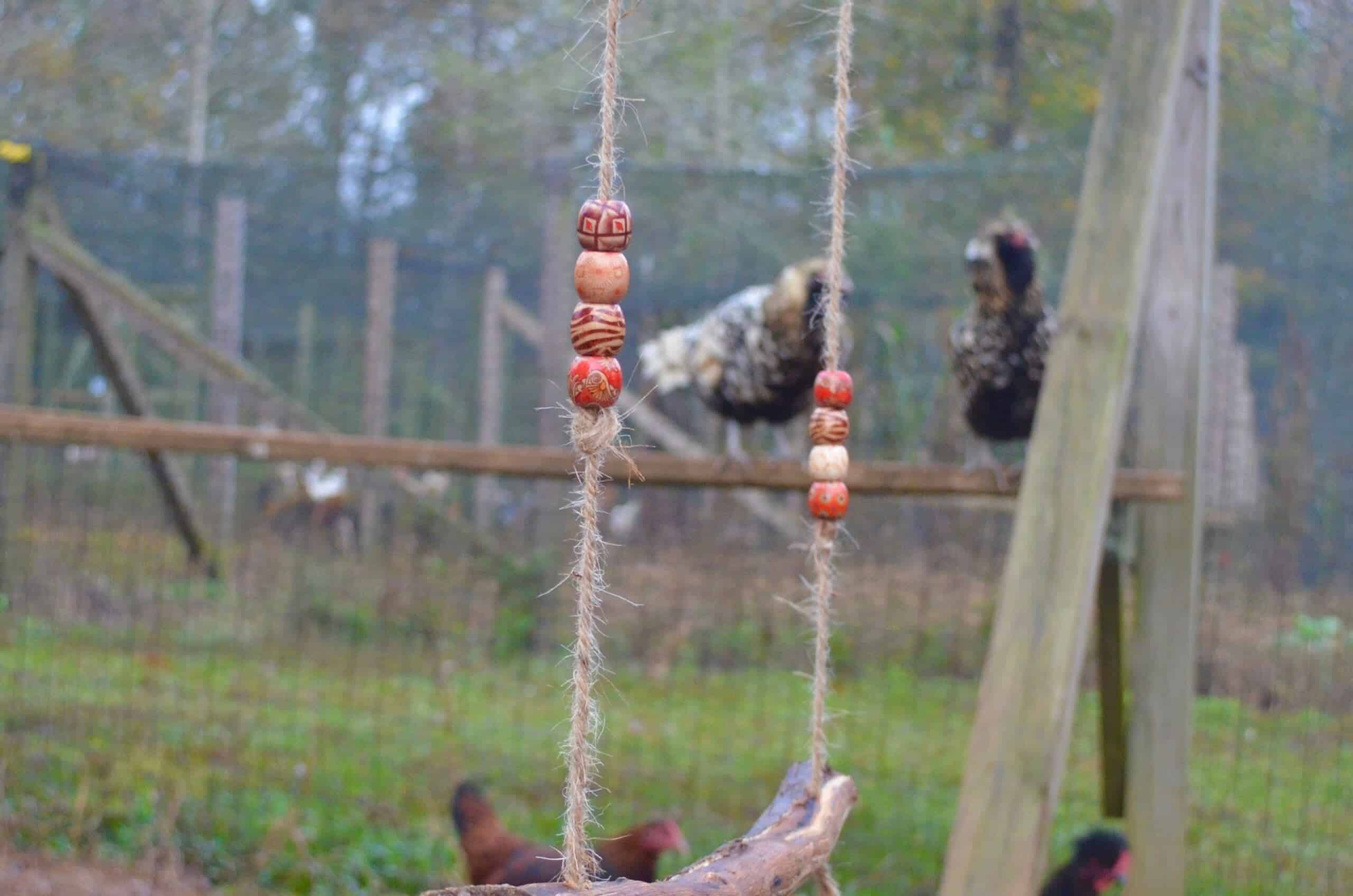 بعد قص الحبل، ولكن قبل ربطه بأي فرع خشبي، يمكنك إضافة بعض الخرزات الخشبية لتسلية الدجاجات، والتي قد تدوّر هذه الخرزات أو تستمتع بشكلها، حتى لو لم تكن الدجاجات التي تربيها فضولية، ستزيد هذه الإضافات من جمالية خم الدجاج. بعد إضافة الخرزات، اربط عقدة تحتها.