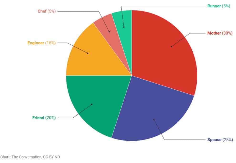 تخيّل أنه قد طُلب منك رسم مخطط بياني على شكل دائرة وتقطيعه بحيث يُظهر أدوارك المختلفة في الحياة، ومدى أهمية كل منها للطريقة التي تشعر بها حيال نفسك، وحيال قيمك التي تعتبرها أولوية. قد تقدّرين دورك كأمٍّ أو كزوجة أو صديقة عالياً؛ وبالتالي ستخصّصين أكبر جزءٍ من المخطط لها.