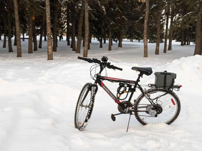 بمجرد وضع هذه القطع في مكانها، وضعت «دماغ» الدراجة (وحدة التحكم في المحرك) أعلى البطاريات في صندوق البطارية، ثم ركّبت صندوق البطارية ورف الشحن على الهيكل. أخيراً، قمت بتوصيل ضوء الفرامل برف الشحن برباطين من الكابلات. يعتمد مكان وضع وحدة التحكم على المساحة المتبقية المتوفرة في صندوق البطارية.