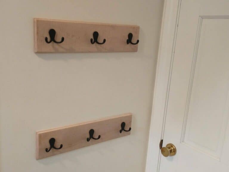 9- تثبيت خطافات المعاطف: بعد تثبيت لوح التعليق على الحائط، قم بتثبيت خطافات التعليق على اللوح مباشرةً، مع التأكد من حفر الثقوب المعدة مسبقاً من الخطوة 5. من الناحية الفنية، إذا كنت لا ترغب في تغطية براغي تثبيت اللوح بالخطافات، يمكنك تركيب الخطافات على اللوح قبل تثبيته على الحائط، الأمر متروك لك.